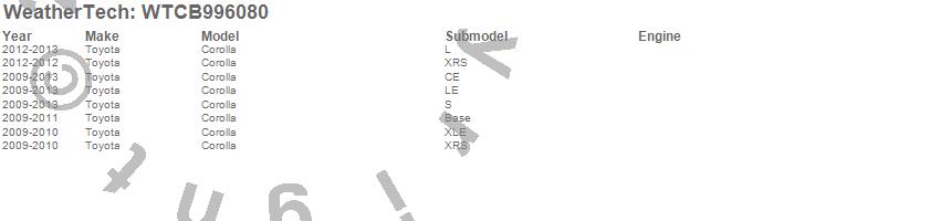 Below is an abbreviated list of applications for the All Weather Floor Mats.Corolla, Toyota, 2013, 2012, 2011, 2010, 2009