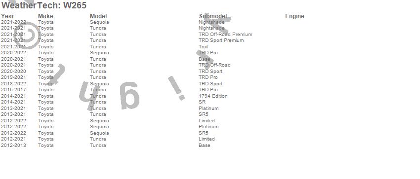 Below is an abbreviated list of applications for the All Weather Floor Mats.Sequoia, Tundra, Toyota, 2022, 2021, 2020, 2019, 2018, 2017, 2016, 2015, 2014, 2013, 2012