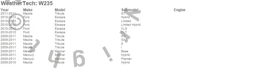 Below is an abbreviated list of applications for the All Weather Floor Mats.Escape, Mariner, Tribute, Ford, Mazda, Mercury, 2012, 2011, 2010, 2009