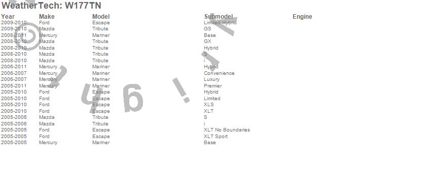 Below is an abbreviated list of applications for the All Weather Floor Mats.Escape, Mariner, Tribute, Ford, Mazda, Mercury, 2011, 2010, 2009, 2008, 2007, 2006, 2005