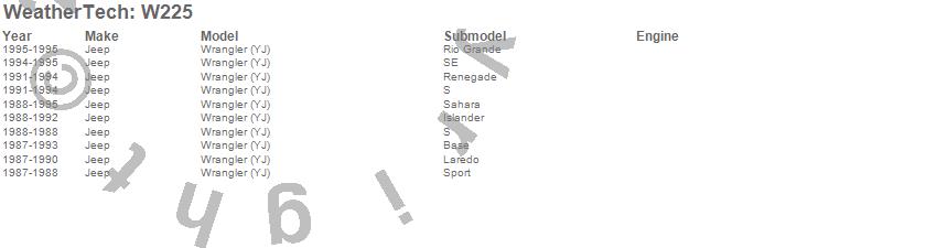 Below is an abbreviated list of applications for the All Weather Floor Mats.Wrangler (YJ), Jeep, 1995, 1994, 1993, 1992, 1991, 1990, 1989, 1988, 1987