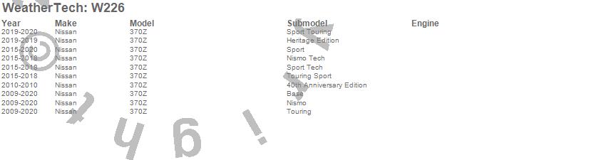 Below is an abbreviated list of applications for the All Weather Floor Mats.370Z, Nissan, 2020, 2019, 2018, 2017, 2016, 2015, 2014, 2013, 2012, 2011, 2010, 2009