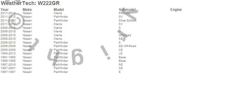 Below is an abbreviated list of applications for the All Weather Floor Mats.Pathfinder, Xterra, Nissan, 2015, 2014, 2013, 2012, 2011, 2010, 2009, 2008, 2007, 2006, 2005, 2004, 2003, 2002, 2001, 2000, 1999