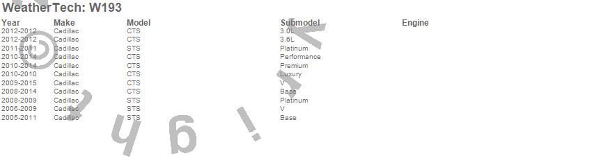 Below is an abbreviated list of applications for the All Weather Floor Mats.CTS, STS, Cadillac, 2015, 2014, 2013, 2012, 2011, 2010, 2009, 2008, 2007, 2006, 2005