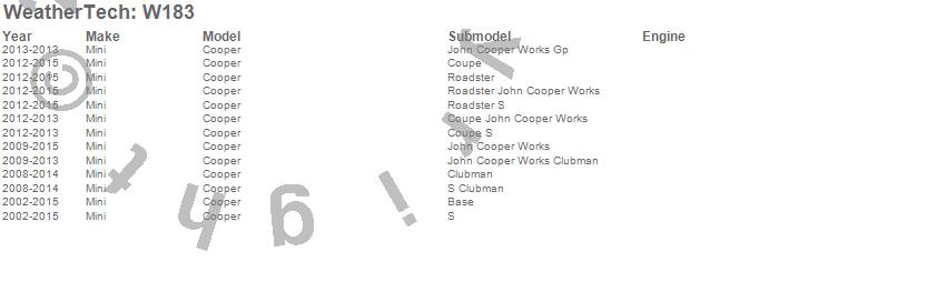 Below is an abbreviated list of applications for the All Weather Floor Mats.Cooper, Mini, 2015, 2014, 2013, 2012, 2011, 2010, 2009, 2008, 2007, 2006, 2005, 2004, 2003, 2002