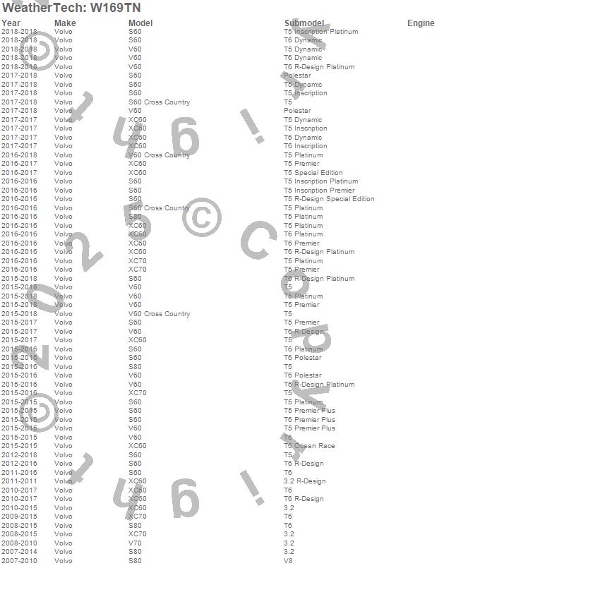 Below is an abbreviated list of applications for the All Weather Floor Mats.S60, S60 Cross Country, S80, V60, V60 Cross Country, V70, XC60, XC70, Volvo, 2018, 2017, 2016, 2015, 2014, 2013, 2012, 2011, 2010, 2009, 2008