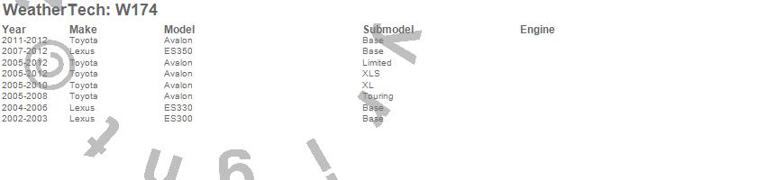 Below is an abbreviated list of applications for the All Weather Floor Mats.Avalon, ES300, ES330, ES350, Lexus, Toyota, 2012, 2011, 2010, 2009, 2008, 2007, 2006, 2005, 2004, 2003, 2002