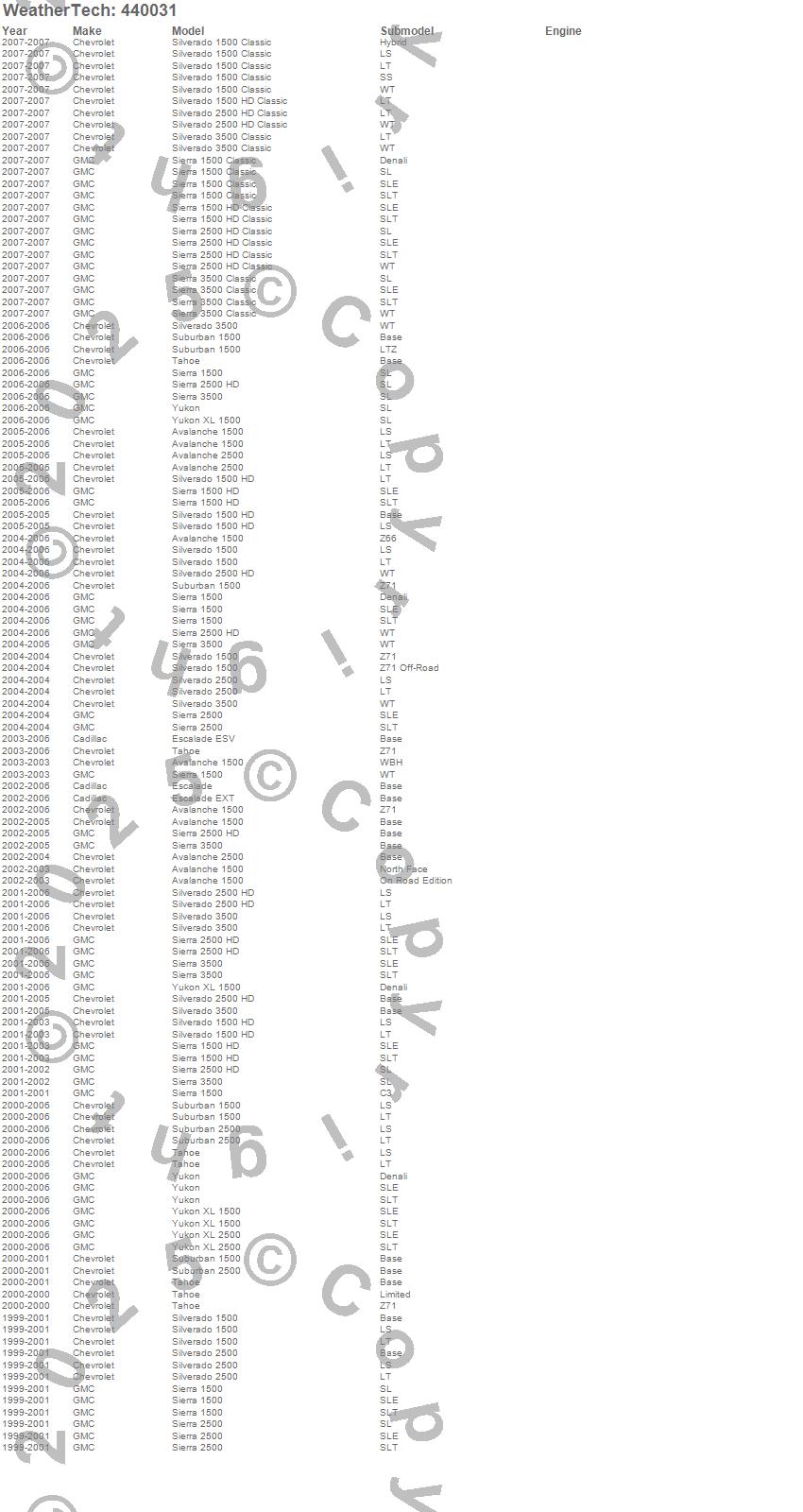 Below is an abbreviated list of applications for the FloorLiner DigitalFit.Avalanche 1500, Avalanche 2500, Escalade, Escalade ESV, Escalade EXT, Sierra 1500, Sierra 1500 Classic, Sierra 1500 HD, Sierra 1500 HD Classic, Sierra 2500, Sierra 2500 HD, Sierra 2500 HD Classic, Sierra 3500, Sierra 3500 Classic, Silverado 1500, Silverado 1500 Classic, Silverado 1500 HD, Silverado 1500 HD Classic, Silverado 2500, Silverado 2500 HD