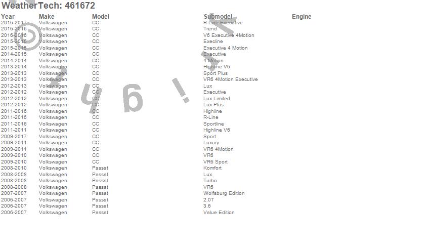Below is an abbreviated list of applications for the FloorLiner DigitalFit.CC, Passat, Volkswagen, 2017, 2016, 2015, 2014, 2013, 2012, 2011, 2010, 2009, 2008, 2007, 2006