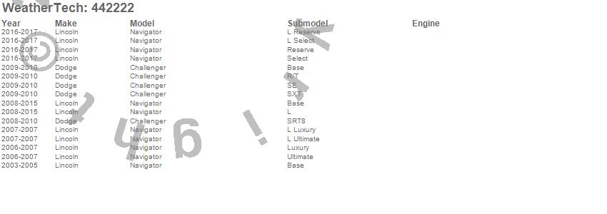 Below is an abbreviated list of applications for the FloorLiner DigitalFit.Challenger, Navigator, Dodge, Lincoln, 2017, 2016, 2015, 2014, 2013, 2012, 2011, 2010, 2009, 2008, 2007, 2006, 2005, 2004, 2003