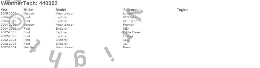 Below is an abbreviated list of applications for the FloorLiner DigitalFit.Explorer, Mountaineer, Ford, Mercury, 2005, 2004, 2003, 2002