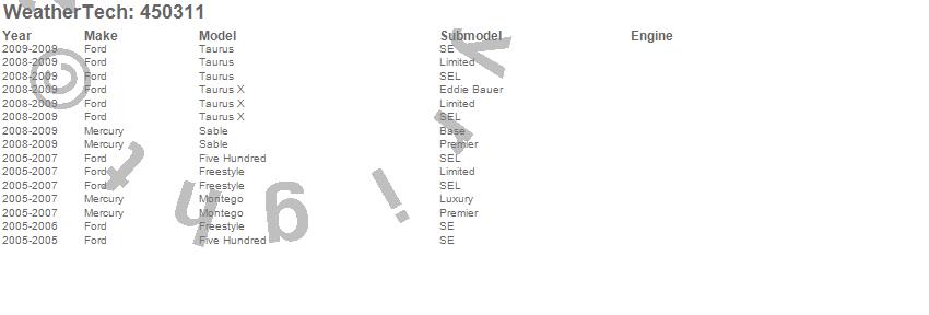 Below is an abbreviated list of applications for the FloorLiner DigitalFit.Five Hundred, Freestyle, Montego, Sable, Taurus, Taurus X, Ford, Mercury, 2009, 2008, 2007, 2006, 2005