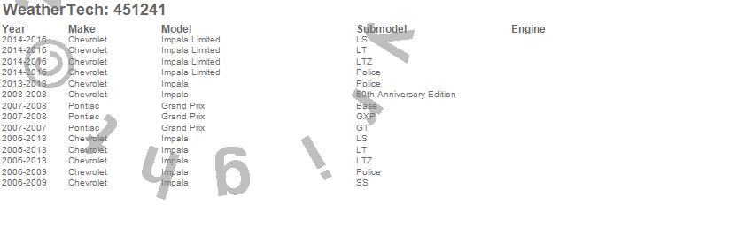 Below is an abbreviated list of applications for the FloorLiner DigitalFit.Grand Prix, Impala, Impala Limited, Chevrolet, Pontiac, 2016, 2015, 2014, 2013, 2012, 2011, 2010, 2009, 2008, 2007, 2006