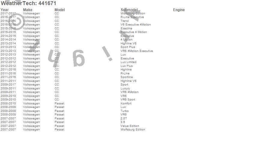 Below is an abbreviated list of applications for the FloorLiner DigitalFit.CC, Passat, Volkswagen, 2017, 2016, 2015, 2014, 2013, 2012, 2011, 2010, 2009, 2008, 2007
