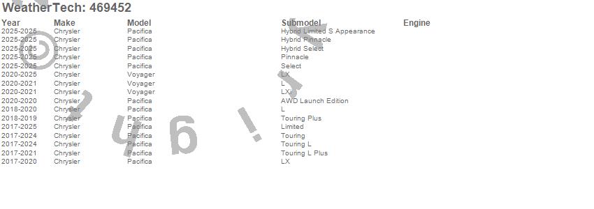 Below is an abbreviated list of applications for the FloorLiner DigitalFit.Pacifica, Voyager, Chrysler, 2026, 2025, 2024, 2023, 2022, 2021, 2020, 2019, 2018, 2017