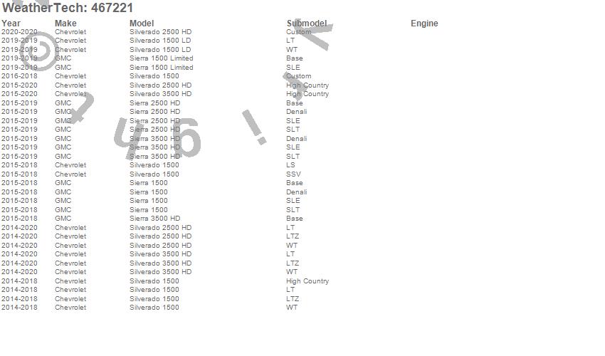 Below is an abbreviated list of applications for the FloorLiner DigitalFit.Sierra 1500, Sierra 1500 Limited, Sierra 2500 HD, Sierra 3500 HD, Silverado 1500, Silverado 1500 LD, Silverado 2500 HD, Silverado 3500 HD, Chevrolet, GMC, 2020, 2019, 2018, 2017, 2016, 2015, 2014