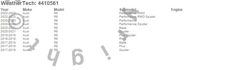 Below is an abbreviated list of applications for the FloorLiner DigitalFit.R8, Audi, 2023, 2022, 2021, 2020, 2018, 2017