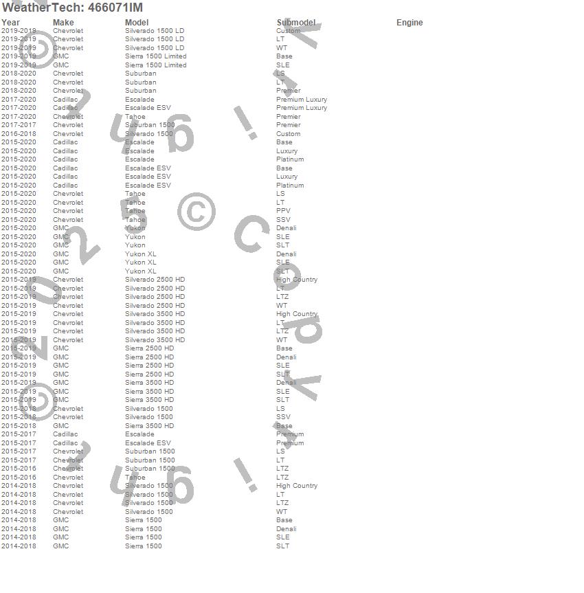 Below is an abbreviated list of applications for the FloorLiner HP.Escalade, Escalade ESV, Sierra 1500, Sierra 1500 Limited, Sierra 2500 HD, Sierra 3500 HD, Silverado 1500, Silverado 1500 LD, Silverado 2500 HD, Silverado 3500 HD, Suburban, Suburban 1500, Tahoe, Yukon, Yukon XL, Cadillac, Chevrolet, GMC, 2020, 2019