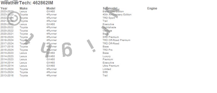 Below is an abbreviated list of applications for the FloorLiner HP.4Runner, GX460, Lexus, Toyota, 2024, 2023, 2022, 2021, 2020, 2019, 2018, 2017, 2016, 2015, 2014, 2013