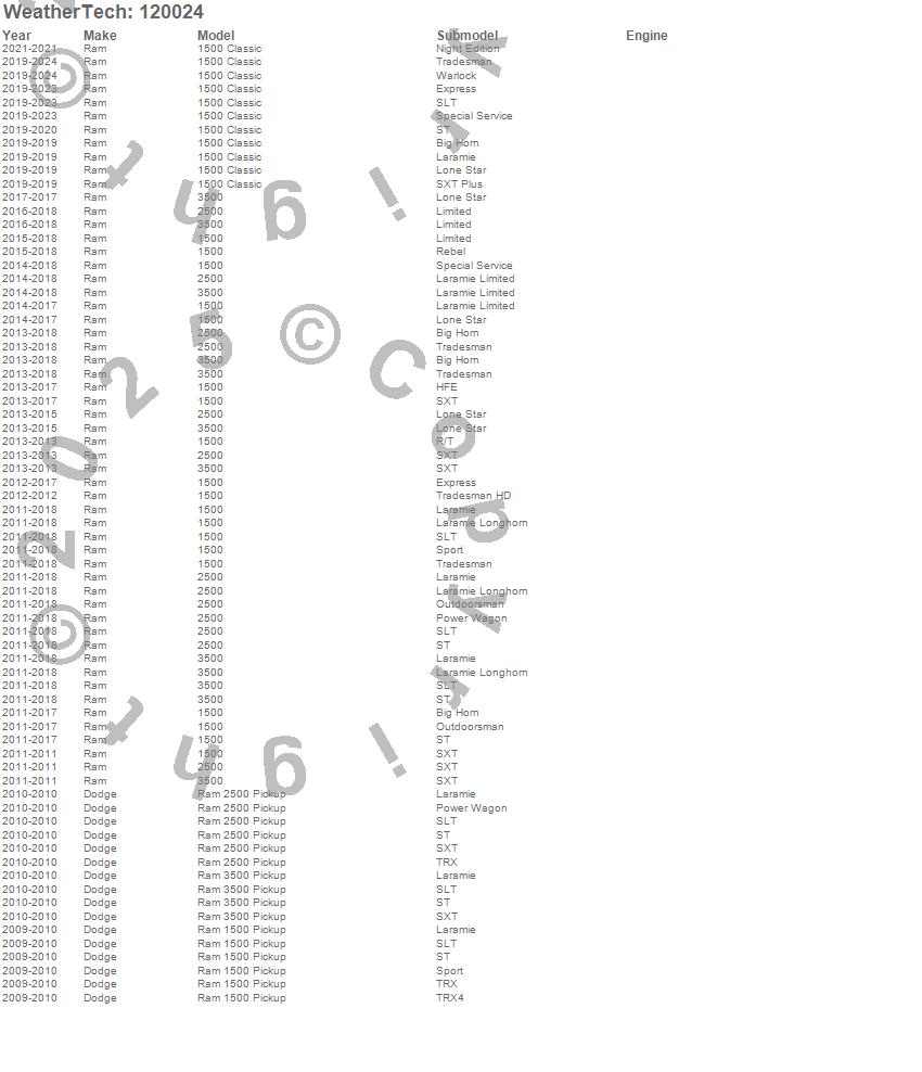 Below is an abbreviated list of applications for the MudFlap No-Drill DigitalFit.1500, 1500 Classic, 2500, 3500, Ram 1500, Ram 2500, Ram 3500, Dodge, Ram, 2024, 2023, 2022, 2021, 2020, 2019, 2018, 2017, 2016, 2015, 2014