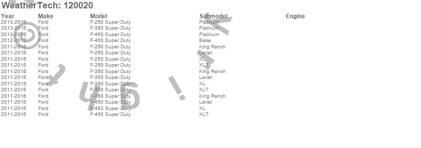 Below is an abbreviated list of applications for the MudFlap No-Drill DigitalFit.F-250 Super Duty, F-350 Super Duty, F-450 Super Duty, Ford, 2016, 2015, 2014, 2013, 2012, 2011