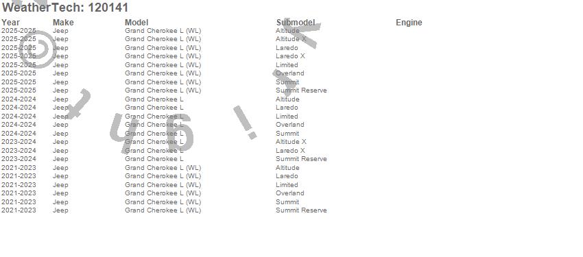Below is an abbreviated list of applications for the MudFlap No-Drill DigitalFit.Grand Cherokee L, Grand Cherokee L (WL), Jeep, 2025, 2024, 2023, 2022, 2021