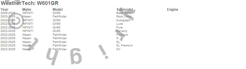 Below is an abbreviated list of applications for the All Weather Floor Mats.Pathfinder, QX60, INFINITI, Nissan, 2025, 2024, 2023, 2022