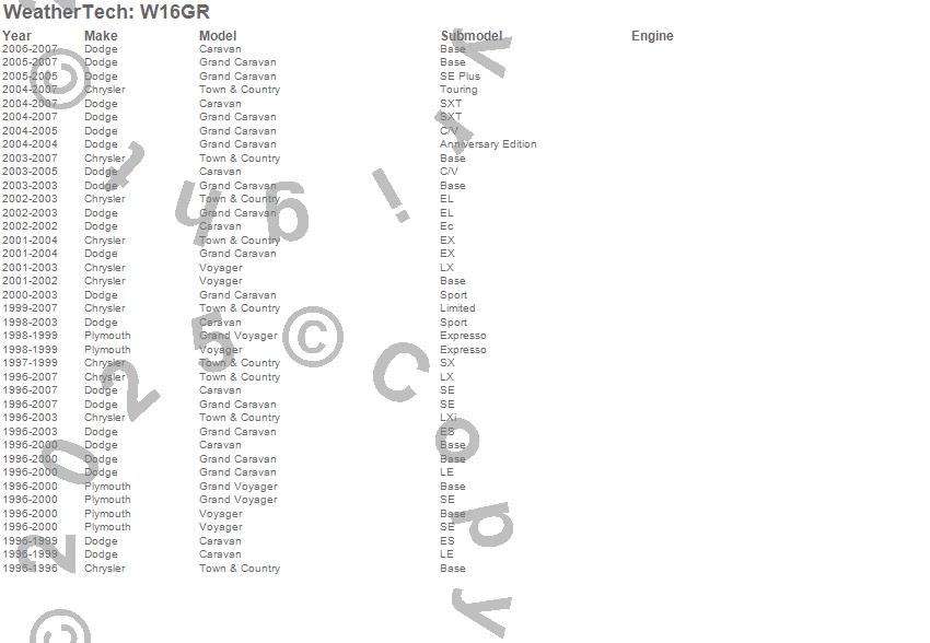 Below is an abbreviated list of applications for the All Weather Floor Mats.Caravan, Grand Caravan, Grand Voyager, Town & Country, Voyager, Chrysler, Dodge, Plymouth, 2007, 2006, 2005, 2004, 2003, 2002, 2001, 2000, 1999, 1998, 1997, 1996