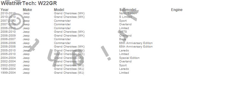 Below is an abbreviated list of applications for the All Weather Floor Mats.Commander, Grand Cherokee (WJ), Grand Cherokee (WK), Jeep, 2010, 2009, 2008, 2007, 2006, 2005, 2004, 2003, 2002, 2001, 2000, 1999