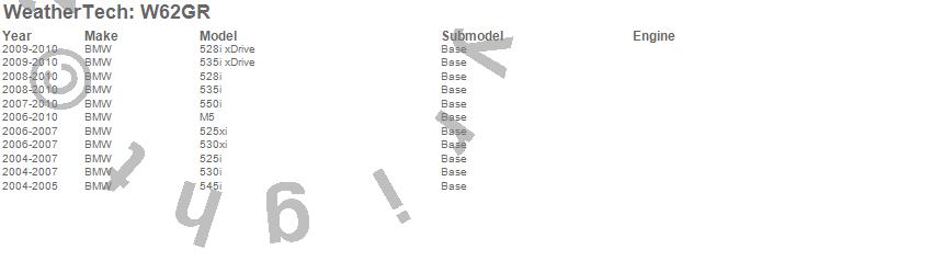 Below is an abbreviated list of applications for the All Weather Floor Mats.525i, 525xi, 528i, 528i xDrive, 530i, 530xi, 535i, 535i xDrive, 545i, 550i, M5, BMW, 2010, 2009, 2008, 2007, 2006, 2005, 2004
