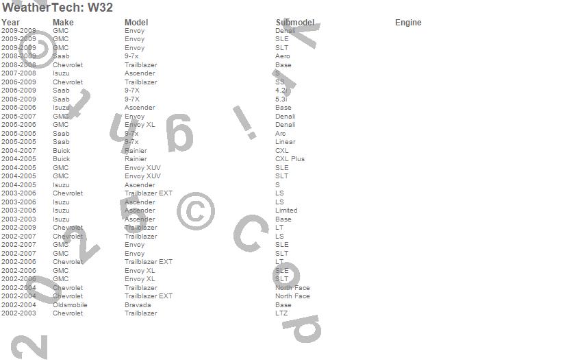Below is an abbreviated list of applications for the All Weather Floor Mats.9-7X, Ascender, Bravada, Envoy, Envoy XL, Envoy XUV, Rainier, Trailblazer, Trailblazer EXT, Buick, Chevrolet, GMC, Isuzu, Oldsmobile, Saab, 2009, 2008, 2007, 2006, 2005