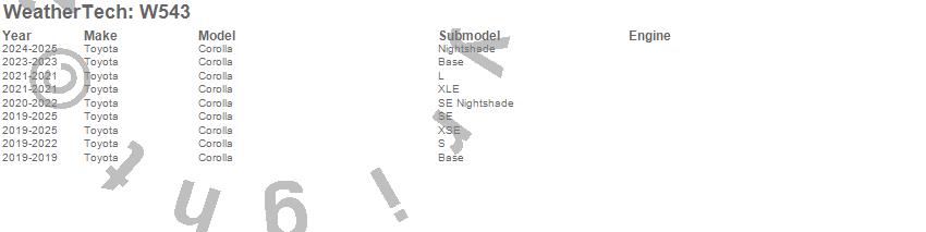 Below is an abbreviated list of applications for the All Weather Floor Mats.Corolla, Toyota, 2025, 2024, 2023, 2022, 2021, 2020, 2019