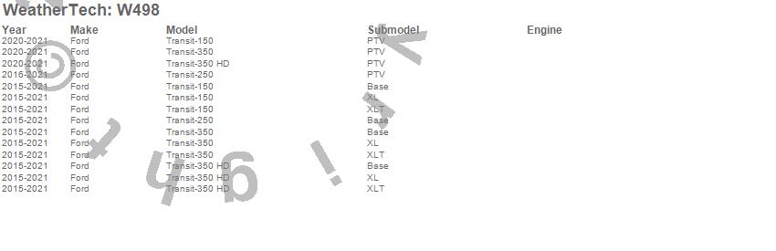 Below is an abbreviated list of applications for the All Weather Floor Mats.Transit-150, Transit-250, Transit-350, Transit-350 HD, Ford, 2021, 2020, 2019, 2018, 2017, 2016, 2015