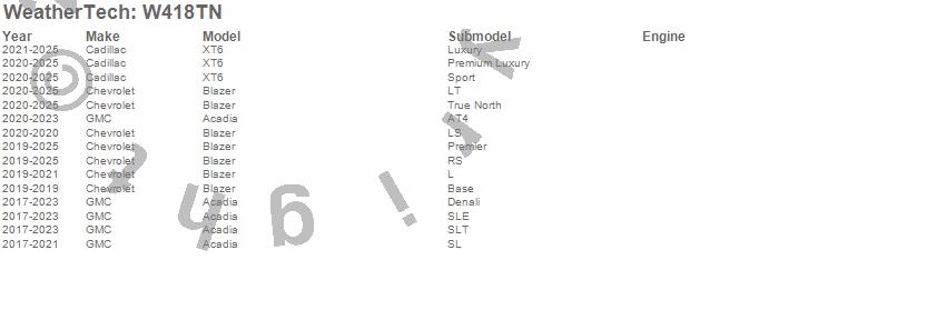 Below is an abbreviated list of applications for the All Weather Floor Mats.Acadia, Blazer, XT6, Cadillac, Chevrolet, GMC, 2026, 2025, 2024, 2023, 2022, 2021, 2020, 2019, 2018, 2017