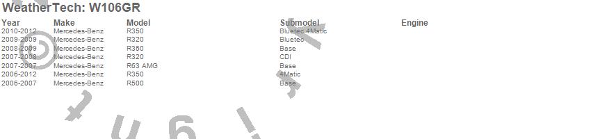 Below is an abbreviated list of applications for the All Weather Floor Mats.R320, R350, R500, R63 AMG, Mercedes-Benz, 2012, 2011, 2010, 2009, 2008, 2007, 2006