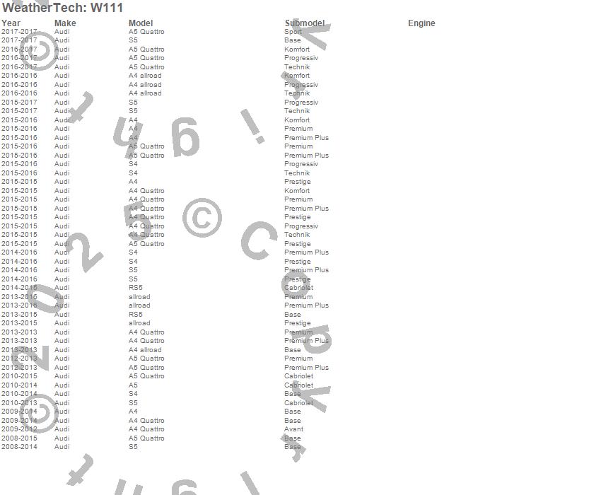 Below is an abbreviated list of applications for the All Weather Floor Mats.A4, A4 allroad, A4 Quattro, A5, A5 Quattro, allroad, RS5, S4, S5, Audi, 2017, 2016, 2015, 2014, 2013, 2012, 2011, 2010, 2009, 2008