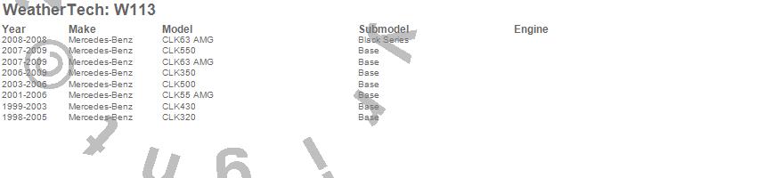 Below is an abbreviated list of applications for the All Weather Floor Mats.CLK320, CLK350, CLK430, CLK500, CLK55 AMG, CLK550, CLK63 AMG, Mercedes-Benz, 2009, 2008, 2007, 2006, 2005, 2004, 2003, 2002, 2001, 2000, 1999, 1998