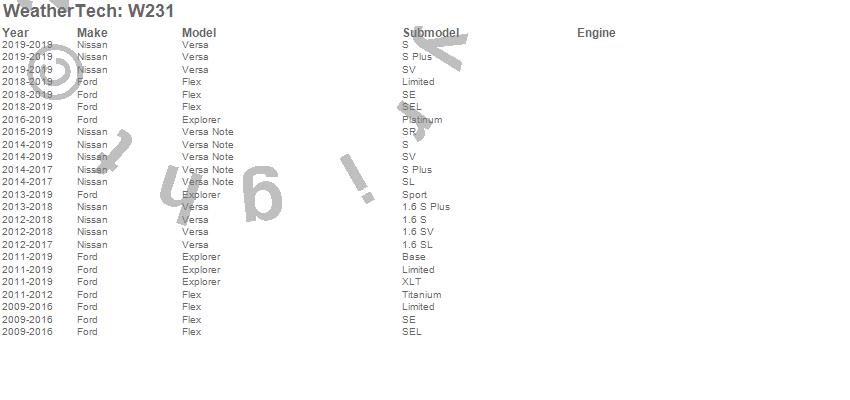 Below is an abbreviated list of applications for the All Weather Floor Mats.Explorer, Flex, Versa, Versa Note, Ford, Nissan, 2019, 2018, 2017, 2016, 2015, 2014, 2013, 2012, 2011, 2010, 2009