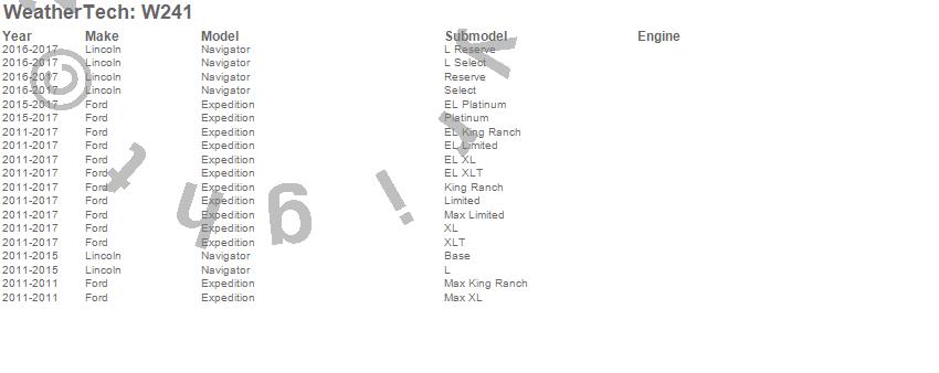 Below is an abbreviated list of applications for the All Weather Floor Mats.Expedition, Navigator, Ford, Lincoln, 2017, 2016, 2015, 2014, 2013, 2012, 2011