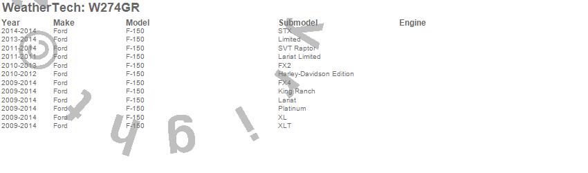 Below is an abbreviated list of applications for the All Weather Floor Mats.F-150, Ford, 2014, 2013, 2012, 2011, 2010, 2009