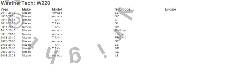 Below is an abbreviated list of applications for the All Weather Floor Mats.Armada, TITAN, Nissan, 2015, 2014, 2013, 2012, 2011, 2010, 2009, 2008