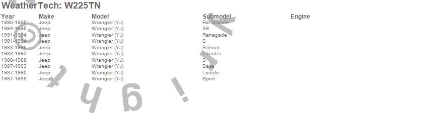Below is an abbreviated list of applications for the All Weather Floor Mats.Wrangler (YJ), Jeep, 1995, 1994, 1993, 1992, 1991, 1990, 1989, 1988, 1987