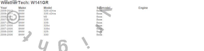 Below is an abbreviated list of applications for the All Weather Floor Mats.325i, 328i, 328i xDrive, 328xi, 330i, 335i, 335i xDrive, 335xi, M3, BMW, 2012, 2011, 2010, 2009, 2008, 2007, 2006
