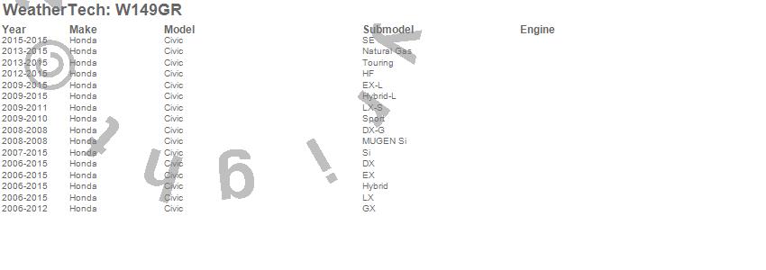 Below is an abbreviated list of applications for the All Weather Floor Mats.Civic, Honda, 2015, 2014, 2013, 2012, 2011, 2010, 2009, 2008, 2007, 2006