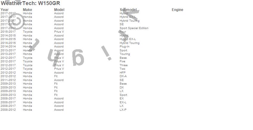 Below is an abbreviated list of applications for the All Weather Floor Mats.Accord, Fit, Prius V, Honda, Toyota, 2017, 2016, 2015, 2014, 2013, 2012, 2011, 2010, 2009, 2008