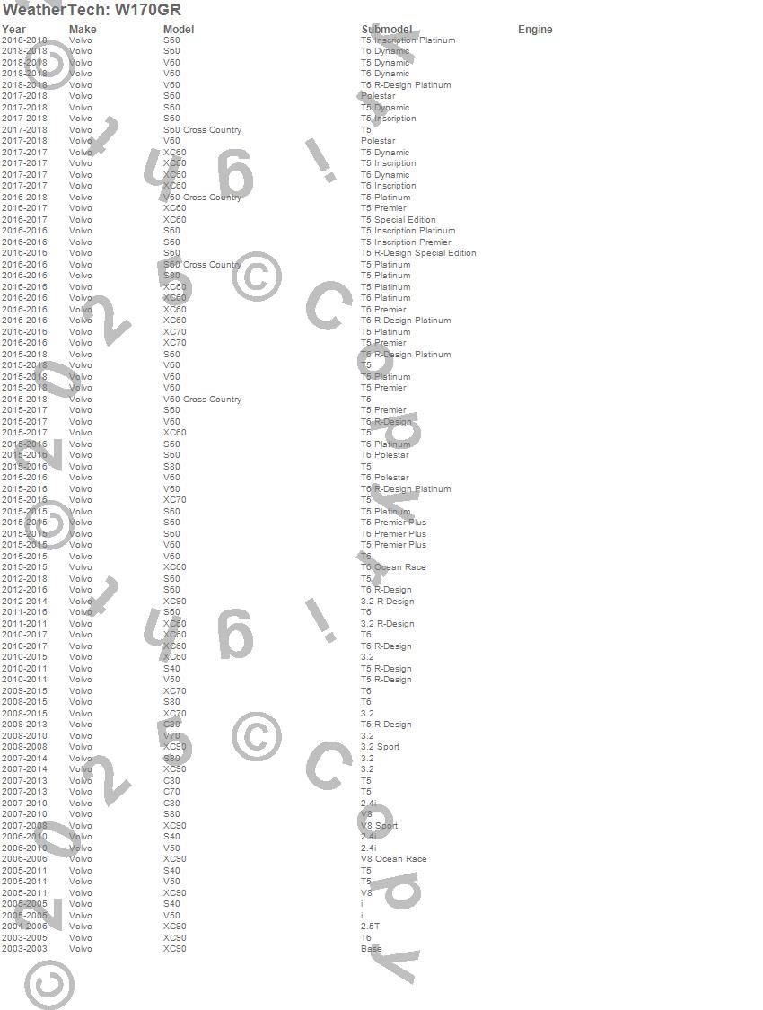 Below is an abbreviated list of applications for the All Weather Floor Mats.C30, C70, S40, S60, S60 Cross Country, S80, V50, V60, V60 Cross Country, V70, XC60, XC70, XC90, Volvo, 2018, 2017, 2016, 2015, 2014, 2013