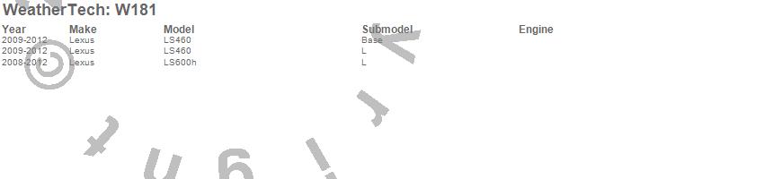 Below is an abbreviated list of applications for the All Weather Floor Mats.LS460, LS600h, Lexus, 2012, 2011, 2010, 2009, 2008