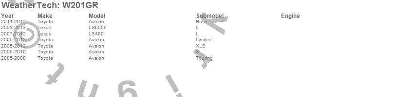 Below is an abbreviated list of applications for the All Weather Floor Mats.Avalon, LS460, LS600h, Lexus, Toyota, 2013, 2012, 2011, 2010, 2009, 2008, 2007, 2006, 2005