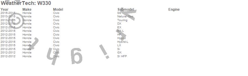 Below is an abbreviated list of applications for the All Weather Floor Mats.Civic, Honda, 2015, 2014, 2013, 2012