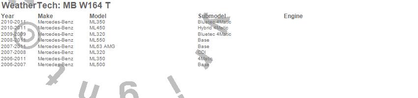 Below is an abbreviated list of applications for the All Weather Floor Mats.ML320, ML350, ML450, ML500, ML550, ML63 AMG, Mercedes-Benz, 2011, 2010, 2009, 2008, 2007, 2006